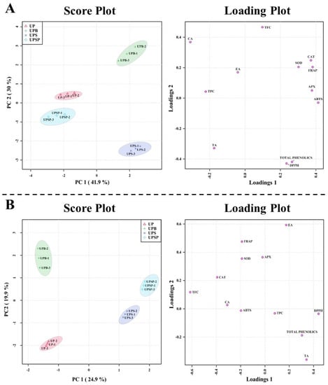 Score and loading plot of (A) PCA model and (B) PLS-DA model acquired from the metabolites detected from different parts of Undaria pinnatifida. Note: ABTS, ABTS radical scavenging activity; APX, ascorbate peroxidase activity; CA, collagenase inhibitory activities; CAT, catalase activity; DPPH, DPPH radical scavenging activity; EA, elastase inhibitory activities; FRAP value, ferric reducing antioxidant power value; SOD, superoxide dismutase activity; TA, tyrosinase inhibitory activity; TFC, total flavonoid content; and TPC, total polyphenol content.