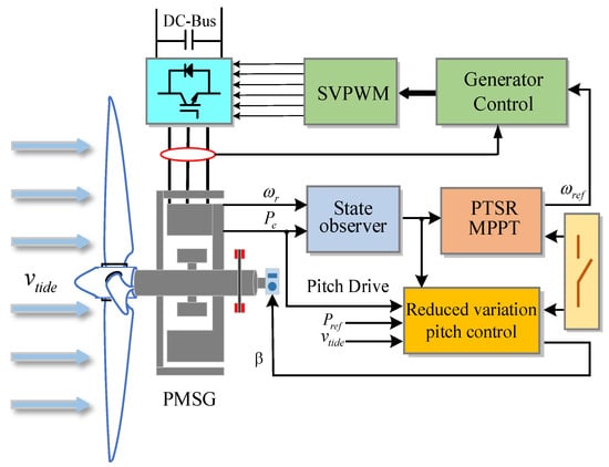 In recent decades, renewable energy resources have attracted extensive attention due to the energy crisis and environmental pollution [1,2]. The tidal current energy is considered as the most promising energy resource due to its regularity, stability, higher energy density, and predictability [3]. However, the tidal stream turbine (TST) system usually operates on complex seabed environments, such as marine organisms, swell effect, and strong storms [4,5]. These factors bring great challenges for the TST system to extract maximum power extraction and estimate the potential marine current energy [6]. To improve the power capture ability of the TST system under the rated flow velocity with these external disturbances, maximum power point tracking (MPPT) strategies are developed to obtain the optimal rotational speed. Moreover, in the event of large spring tides or strong sea states [7], mechanical fatigue of the rated power TST system may appear during the dynamic process. The mechanical wear will shorten turbines’ lifetime in the long term, and the maintenance cost of the TST is always too high. Therefore, when the TST system operates above the rated power, the MPPT strategy must be changed into pitch control for smoothing the output power.
