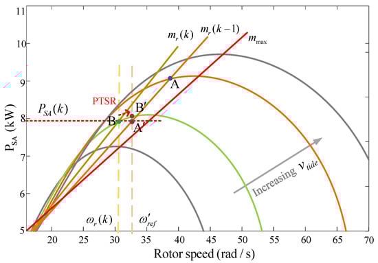 Case 1: When , as shown in Figure 4, P&O MPPT law only reverses tracking direction to point C which is a logic error. However, the slope values guide back to the previous known TSR state (point ) and determine the best search direction of the MPP by monitoring the power speed change radio (PSCR), as shown in Equation (17).