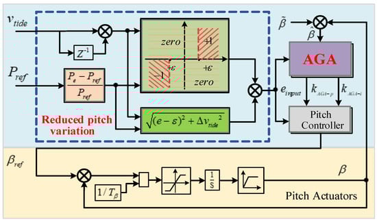 where is the rated power value of the TST system. Figure 6 shows the pre-processed pitch control diagram. The pitch actuator does not act within the preset safety power allowance of defined at of the rated power [14]. When the output power of the TST system is beyond this range, the input error of the pitch controller will increase accordingly and can be calculated as in Equation (22):