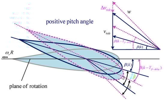 - Based on the blade element theory [13], the effect of pitch angle delay on classical pitch controllers is presented in Figure 7. The actual pitch angle can be expressed as:where is the pitch angle deviation, is the relative velocity of tidal current to the plane of rotation; is the angle of the attack, which is fixed as rated value. The delayed pitch angle output from the pitch controller leads to the imprecise adjustment to current speed variation . To solve the pitch angle delay under different sea conditions, the actual pitch angle is considered in the cost function , designed as:where is the coefficient used to compromise error and pitch action, and is a positive constant value.
