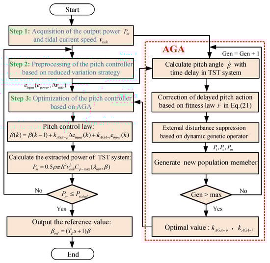 where is the optimal pitch angle output from the proposed reduced variation AGA-PI controller, is the pitch action time constant. To reduce the risk of pitch actuator damage from overuse, the pitch angle is limited to a range of in normal operation. Figure 8 shows a flowchart of the AGA optimization method used to tune pitch controller parameters online for the TST system. The process in the red dotted box presents the details of step 3 AGA.
