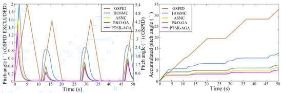As shown in Figure 9b, the accumulated pitch angle of the HOSMC is decreased to 11.102° compared to 32.433° of the conventional control strategy. The ASNC and P&O-GA display lower pitch angle moment variations, while the proposed pitch control strategy has only 4.28° with the best power-limiting performance over the rated current speed.