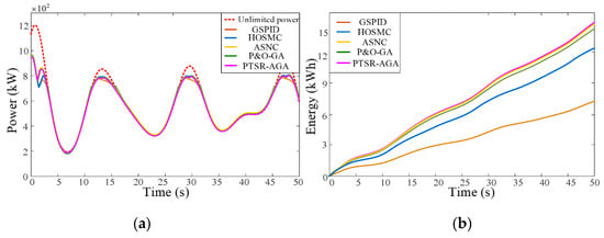 where IAE represents the overall performance of speed tracking response, the FAP emphasizes the power capture performance during the low current speed periods, the fewer IAPE means better power limiting performance and regulation. Figure 11a shows the output power curves of five control strategies under different sea conditions. The conventional GSPID method is greatly affected by external disturbances and has an undesirable IAPE value of 2.01 × 104 kW. Although the HOSMC can suppress the chatting and improve the power extraction efficiency, this method shows negligible pitch angle variations of 11.102°. Considering the large inertia and parameter uncertainties of the TST system, the ASNC and P&O-GA strategies confine the power within the safety allowance range with lower IAPE of 1.64 × 104 kW and 1.56 × 104 kW. However, the power fluctuation is still large with a maximum amplitude of 0.41 × 102 kW and an overshoot of 5.125%. While the proposed PTSR-AGA method outputs smoother power of only 1.01 × 104 kW with the highest FAP index of 23.4 under the premise of efficient energy generations. From the perspective of total energy generated by the TST system, as shown in Figure 11b, the conventional GA-PID strategy obtains nearly 7.64 kWh, while the ASNC and P&O-GA methods capture more energy with 15.03 kWh and 15.51 kWh better than the HOSMC by 11.2% and 14.78% respectively. However, the proposed PTSR-AGA yields the maximum energy with 15.55 kWh, so the system guarantees the higher-energy capture efficiency under both turbulent and strong sea storm conditions.