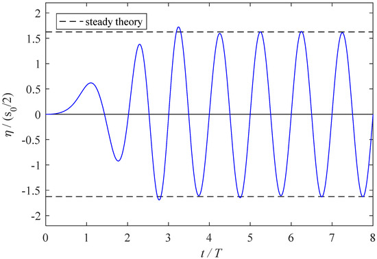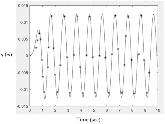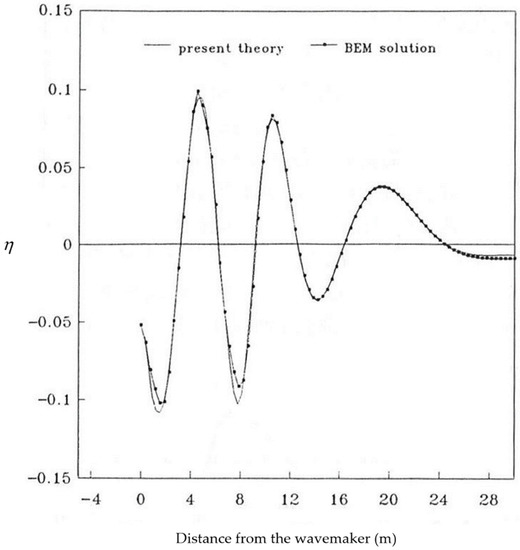 The generated surface waves by the wavemaker at 8.0 s, calculated using Equation (31), was validated with the numerical boundary element solution, as shown in Figure 6. The result is cited from Figure 13 in Lee [15]. The conditions used were water depth 3 m, length of the channel 30 m, stroke, and period of the wavemaker at 1.0 m and 2.0 s, respectively. The comparisons of the unsteady wave profiles were in reasonable agreements. The present analytical solution and the numerical solution matched very well for the first wave length. For the rest of the wave forms, the numerical solutions had slightly higher wave peaks and shallower wave troughs, with maximum 5% differences. The present analytical solution was further used to simulate experimental results presented by Gao [29]. In the experiments, the water depth was 0.28 m and the stroke and period of the wavemaker motion were 0.02 m and 1 s, respectively. The length of the wave channel was 8.75 m. Variation of the free surface elevation with time at a location 0.55 m in front of the wavemaker was used for comparison. Calculated results using present analytical solution (line) and experimental results (discrete star) copied from Gao [29] are plotted in Figure 7. The comparison shows favorable agreements. Note that the wave amplitude calculated by using the steady wavemaker theory was 0.0125 m. At wave peaks, the two results match the steady theory; however, at wave troughs, the present analytical solution matches the steady theory, but the experimental results are shallower, and the differences are approximately 12%.