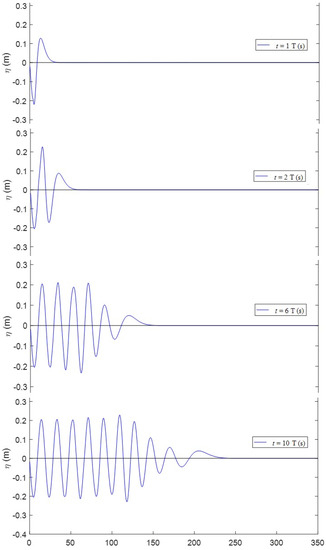 The present analytical solution can be used to simulate transient development of waves generated by the wavemaker in a channel. Time variations of surface waves in front of the wavemaker along the wave channel at one-period time, two-periods, six-periods, and 10-periods of the wavemaker motion are shown in Figure 8. At time one-period, a developing wave form is induced, where a smaller wave peak is ahead of a lower trough propagating away from the wavemaker. At the two-period time, two wave forms are generated along the channel. A smaller wave is propagating ahead of a bigger wave, while waves are propagating away from the wavemaker. The wave forms are gradually developing, and it is expected that as more waves are continuously generated, the wave forms will reach fully developed conditions. At the six-period time, there are six unsteady waves in front of the wavemaker; among them there are four developed waves behind the two smaller leading waves. As for the 10-period time, there are four fully developed waves behind the four leading transient waves. We can notice that between fully developed waves and the leading waves, there is a highest wave. The simulated results indicated that there is a relatively bigger wave between developing waves and fully developed steady waves, which is about 15% bigger than the steady wave heights. As more time elapsed, there will be more fully developed waves generated following the leading waves.