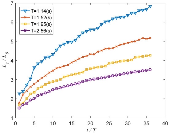 Using the present analytical solution, we calculated the generated waves to investigate unsteady characteristics of the wave heights and wave lengths of the leading waves. The conditions used are water depth 0.35 m, the stroke of the wavemaker motion 0.019 m, and the wavemaker periods 1.14 s, 1.52 s, 1.95 s, and 2.56 s. Figure 9 shows variations of dimensionless wave height versus dimensionless time, where is the steady wave height and is the wave height of the leading waves. Overall, the wave heights of the leading waves decrease as they propagate away from the wavemaker. For shorter waves, the wave heights decrease rapidly in the beginning five periods of time; on the other hand, for longer wave periods, the wave heights decrease rapidly in the beginning 15 periods of time. For 25 to 35 periods of time, the wave heights decrease and become gradual, showing a tendency of reaching constants. The shorter waves reach 0.1 and the longer waves reach 0.2. Figure 10 shows variations of dimensionless wave lengths of the leading waves versus dimensionless time, where is the steady wave length and is the wave length of the leading waves. The wave length of the leading wave is defined as the distance starting from the raised water front to the first following zero-up crossing. In general, the wave lengths of the leading waves increase with time as they propagate away from the wavemaker. The calculated results indicate that for longer waves, tendency of wave length increase will reach 3.5; on the other hand, for shorter waves, the tendency will reach 7.