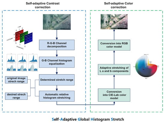 Due to the complexity of underwater environments, underwater images often contain visual distortions, such as low contrast, color distortions, and foggy effects. Before performing computer vision tasks, it is usual to consider image enhancement preprocessing methods. Using image enhancement methods, image quality can be improved and the use of high-quality images facilitates object detection. The main motivation and guidelines for designing the network architecture of the proposed framework are addressed as follows. In this section, a two-stage self-adaptive global histogram stretching algorithm (SAGHS) is introduced, which was based on the structure decomposition and characteristics of underwater imaging, as shown in Figure 1. It included a self-adaptive contrast correction module and a self-adaptive color correction module. In the self-adaptive contrast correction module, the first step was to decompose the RGB channels and then apply color equalization and SAGHS to adjust the dynamic stretching range. In addition, a bilateral was used to eliminate noise. In the self-adaptive color correction module, RGB images were converted into a CIELAB model and then a simple linear histogram stretching was applied to adjust the “L” component. The adjusted CIELAB model was finally converted back into an RGB model. The basic principles and definition were as follows.