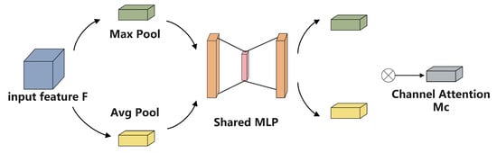 The structure of the channel attention module is shown in Figure 3. The channel attention module compressed the spatial dimensions of feature maps using average pooling and max pooling. The max pooling preserved more image texture information. To retain more of the background information in the images, the average pooling computed the average of all components in the pooling zone. The channel attention module used both the average and max pooling to aggregate the spatial information of features and deliver two different spatial context descriptors: and . To build a distinct channel attention map (), the two descriptors were transmitted to a shared multilayer perception (MLP). The channel attention mechanism allowed the importance of individual feature channels to be modeled and then enhanced or suppressed different channels for specific tasks. In this study, we increased the weights of the channels that contributed the most to detection accuracy and decreased the weights of the channels that did not contribute much to detection accuracy, which ultimately improved the detection accuracy of the network. In the channel attention module, the calculation formula of the weight coefficient matrix was expressed as: