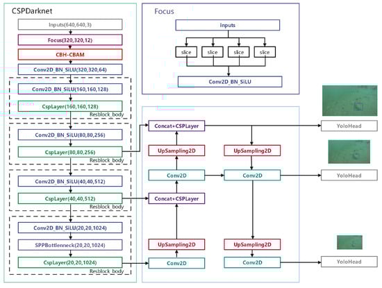 - The integration of a convolutional block attention module (CBAM) into CSPDarknet53 to enhance the features of small, overlapping, and occluded objects. In particular, the CBAM mechanism can be employed to improve the contrast between an object and the surrounding environment and refine redundant information that is produced by the Focus function;