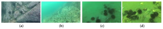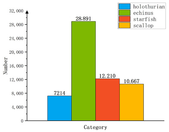 In this study, the underwater robot professional contest 2021 (URPC2021 Dalian) benchmark dataset was used for training. This benchmark dataset was created primarily to provide resources for evaluating underwater domain detection algorithms for picture and video sequences. The images in this benchmark dataset were obtained from the frame rate interception of videos that were captured by an underwater robot ROV in natural environments. The URPC2021 dataset contains 8200 underwater images and box-level annotation. There are four categories in this dataset: holothurian, echinus, starfish, and scallops. This study randomly divided all of the images into a training set and a validation set at a ratio of 0.85:0.15. This section presents the statistics of the distribution of objects in each category, which are also shown in Figure 7.