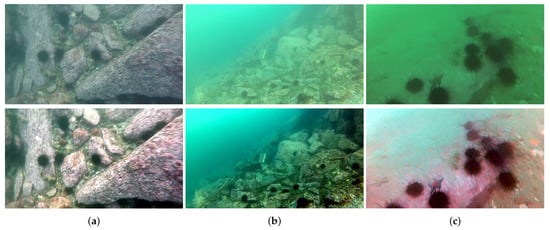 Examples of the enhanced underwater images. The top row shows the raw images and the bottom row shows the results of the proposed SAGHS method: (a) low contrast; (b) bluish background; (c) greenish background.