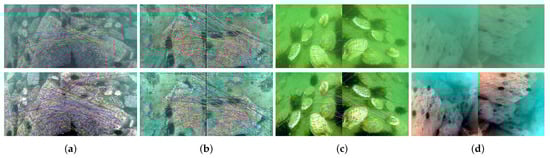 The results of the SIFT feature matching. The top row shows the raw images and the bottom row shows the results of the proposed SAGHS method: (a) low contrast; (b) low resolution; (c) greenish background; (d) bluish background.