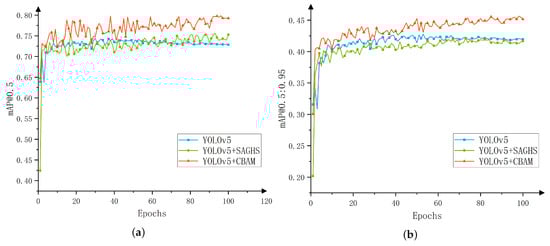 In this section, we present the results of our object detection experiments. To evaluate the efficacy of the improved YOLOv5 model, it was compared to a baseline model. Figure 11 depicts the mAP curves of three algorithms using the URPC2021 validation set and reveals that mAP values of 0.5 (i.e., the IoU was set to 0.5 and the AP was calculated for all images in each class and then averaged over all classes) and 0.5:0.95 (i.e., the average mAP across multiple IoU thresholds for each of the three models (from 0.5 to 0.95, with a step size of 0.05)) tended to be steady as the number of epochs increased. Each model began to converge around the fifth epoch. As can be seen from Figure 11a, the curves tended to be stable and the detection effects of YOLOv5 + SAGHS and YOLOv5 + CBAM were better than that of the baseline for mAP = 0.5. When mAP = 0.5:0.95 was used to evaluate the algorithms, the curve of YOLOv5 + SAGHS was lower than those of the baseline and YOLOv5 + CBAM, as shown in Figure 11b. This was because the underwater image enhancement methods led to intense precision and the processed images demonstrated few differences between objects and the background (such as between echini and rocks), thus affecting the detection accuracy.