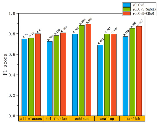 In addition, the F1 score was also chosen as a single and whole category evaluation metric to validate the detection accuracy of the three primary algorithms in each category. Figure 13 demonstrates that the F1 scores were over 0.75 for the majority of categories. The proposed method outperformed the baseline model for various organism detection and produced the greatest overall performance. Other than in scallop detection, the YOLOv5 + CBAM algorithm performed better than the YOLOv5 + SAGHS model. This was because the backbone network with the attention mechanism was more capable of extracting meaningful feature information.