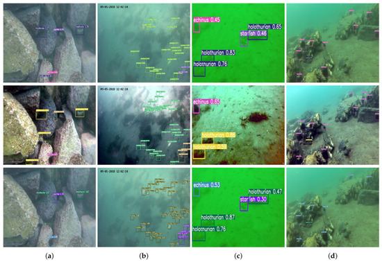 From our analysis of the four difficult detection algorithms (as shown in Figure 14), complex underwater environments and small targets were the main reasons for detection errors. In relation to the other selected models, the YOLOv5 + SAGHS method aimed to solve these underwater degradation problems to enhance color and contrast quality, thereby distinguishing objects from the background so that the target information could be successfully learned and the number of detection errors could be reduced. As shown in Figure 14a, the detection accuracy that was obtained using the YOLOv5 + SAGHS model was significantly higher when holothurian and rocks were similar in color. The SAGHS method reduced the number of object identification errors, as evidenced in Figure 14b. However, the YOLOv5 + SAGHS algorithm could repeatedly and incorrectly detect objects, as shown in Figure 14c,d. Because scallops and echini are small and often in dense populations, the YOLOv5 + CBAM algorithm was used to detect them. The CBAM mechanism could not only effectively improve the backbone network’s capacity to extract object feature information but could also make it easier to recognize marine organisms in different underwater scenes. The fusion strategy that involved a lightweight attention mechanism combined with a backbone network could increase the generalization performance of the network model.