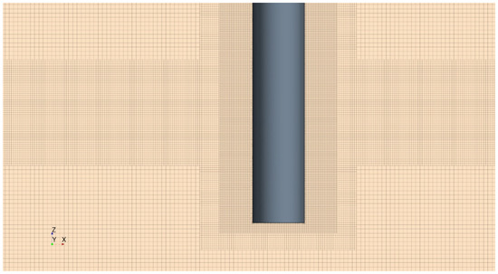 Grids were refined in the vicinity of the free surface, ranging from z = −0.10 to 0.20 m, and at the cylinder to dissolve the wave shape and the higher velocities more accurately and to prevent unwanted vortices forming at the cylinders. Cell lengths were 0.0125 m for the coarse grid, 0.00884 m for the medium grid, and 0.00625 m for the fine grid. For the remaining area, the cell length was 0.025 m for the coarse grid, 0.01768 m for the medium grid, and 0.0125 m for the fine grid. The cell length in the vicinity of the cylinder was 0.00625 m for the coarse grid, 0.00442 m for the medium grid, and 0.003125 m for the fine grid. The total thickness of the prism layer was 0.00532 m for the coarse grid, 0.00376 m for the medium grid, and 0.00266 m for the fine grid, whereas the thickness of the first prism layer was 0.031 × 10−3 m for all grids. Figure 1 shows a side view and Figure 2 a top view of the grids (at z = 0 m) surrounding the large cylinder.