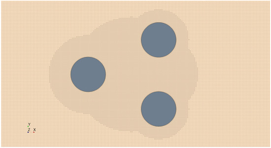 The simulations for the second scenario were obtained only with the implemented turbulent model. The time step size and basic grid structure were based on results from our previous validation study [11] and adapted for the tripod configuration. A prism layer thickness of 0.00266 m was defined for the large-sized cylinders and 0.00215 m for the medium-sized cylinders. The thickness of the first prism layer was 0.031 × 10−3 m for the large cylinders and 0.03 × 10−3 m for the medium-sized cylinders, thereby obtaining the same low wall y+ number. Seven prism layers were considered. The cells surrounding the upstream and downstream cylinders were 0.003125 m long, which enabled to accurately capture the turbulent flow in the area between the cylinders and, therefore, to account for the vortex-induced interaction between the cylinders. To evaluate the effectiveness of the Morison equation, the cylinders were removed from the numerical canal, and the velocities and accelerations were gathered at the positions of the removed cylinders. Figure 3 depicts a top view of grid refinement in the vicinity of the three large cylinders at the height of z = 0 m. Table 4 lists particulars for the numerical cases.