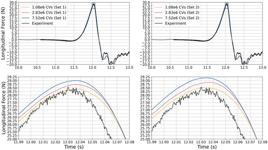 Sets 1 and 2 yielded the discretization independent impact loads of 28.54 N and 28.52 N, respectively, see Figure 7. The favorable agreement between the measured impact load of 28.55 N and the discretization independent impact loads in both sets indicated that the computations were able to yield reliably predictions. Table 5 summarizes these results and lists the calculated and measured value for the impact loads and the deviation between both. Recall that these load computations were based on the turbulent flow model.