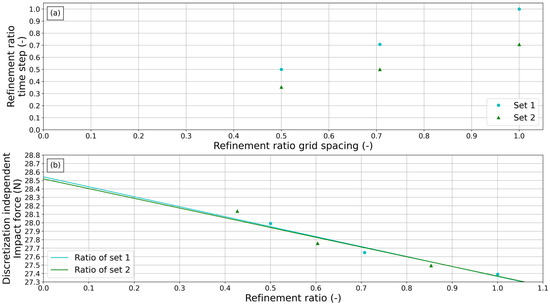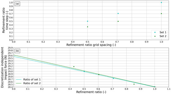Time step refinement ratio versus grid spacing refinement ratio (a) and grid spacing and time step independent longitudinal impact load versus the arithmetic mean of the xij and yij (b) based on the laminar flow model.