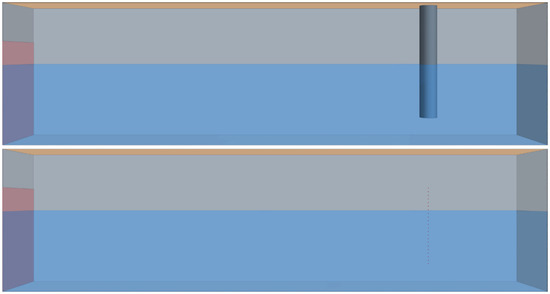 The first scenario comprised tests of two single steel cylinders situated vertically in the canal at a longitudinal distance of 11.62 m from the wave maker and 0.91 m from the rear wall. A six degrees-of-freedom load sensor was fixed to a flange mounted at the top of each cylinder. This load sensor was enclosed in a frame whose height position was adjustable. Both cylinders had a length of 0.80 m, but they were each fixed at two different height positions to enable investigating impact loads at different immersion depths. In their low positions, the lower end of the cylinders was situated 0.198 m above the tank’s bottom; in their high positions, 0.398 m above the tank’s bottom. The small cylinder’s diameter was ; the large cylinder’s diameter was . The purpose of these first scenario tests was to compare experimental data with numerical predictions.