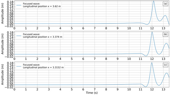 To account for the effect of Newtonian viscosity, the non-breaking focused wave was generated on the basis of the Ricker spectrum with a peak period of = 2.617 s. The focal point of the focused wave was set at a longitudinal distance of x = 11.69 m from the wave maker [18]. The position of the focal point was thus close to the center of the cylinders in the first scenario; specifically, it was positioned at a distance of 11.62 m from the wave maker. Table 1 lists the focused wave’s greatest height of = 0.214 m and the two parameters of m = 1.42 and T = 0.2285, which had to be specified to generate this wave in the first and second scenarios.