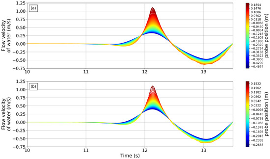 Time histories of pre-calculated flow velocities at probe points in the first scenario for the single cylinder immersed to a depth of z = −0.4690 m (a) and to a depth of z = −0.2690 m (b). The color bar indicates the vertical position of the probe points.