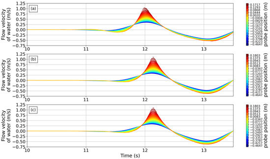 In the first scenario, the wave period 1.87 s and the maximum velocity were the same for all simulations because the location of the probe points along the single cylinder did not change. In the second scenario, the longitudinal position of the upstream cylinder differed from that of the downstream cylinders and, thus, the wave period was modified. While the wave period for the downstream cylinders remained at about 1.87 s in all simulations, the modified wave period was 2.32 s for the large-diameter upstream cylinder and 2.29 s for the medium-diameter upstream cylinder.