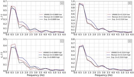 Figure 15 presents the comparative frequency spectra of load coefficient cx, derived via a fast Fourier transform (FFT), for the low- and high-positioned cylinder in the first scenario. Again, a black line identifies cx values based on experimentally measured loads; a dark red line, cx values based on URANS computed loads; an indigo line, cx values based on loads calculated with the Morison equation. Figure 15a,c of this figure refer to loads acting on the small-diameter cylinder in its low and high positions, respectively; Figure 15b,d of this figure refer to loads acting on the large-diameter cylinder in its low and high positions, respectively.