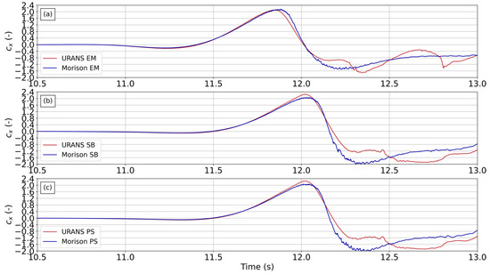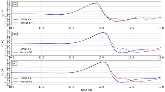 Figure 16 presents comparative time histories of load coefficients for the medium-diameter cylinders in their tripod configuration, i.e., in the second scenario. The dark red line identifies the URANS computed coefficients and the indigo line, the coefficients calculated with the Morison equation. These identifications apply also to the Figure 17, Figure 18 and Figure 19. Graphs (a) of these figures refer to coefficients for the upstream cylinder; Graphs (b) refer to coefficients for the downstream starboard cylinder; Graphs (c) refer to coefficients for the downstream portside cylinder. For the upstream cylinder, the impact from the Morison equation was slightly higher than the impact from for URANS computation; however, for both downstream cylinders, the impact from the Morison equation was slightly lower than the impact from the URANS computation. For the upstream cylinder, the temporal progression of load coefficients obtained from both methods agreed better than for the two downstream cylinders. The wake effect from the upstream cylinder could not be captured by the Morison equation because the upstream cylinder was not accounted for in these computations.