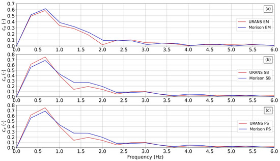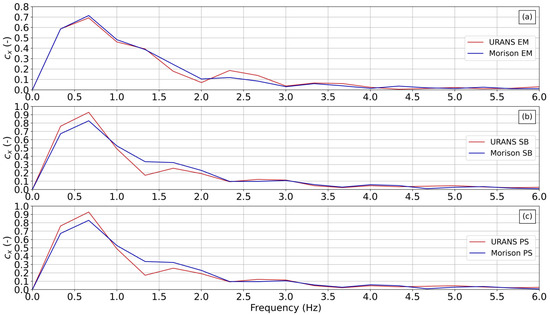 Figure 17 presents comparative frequency spectra of load coefficient cx, derived via a fast Fourier transform (FFT), for medium-diameter cylinders in their tripod configuration, i.e., in the second scenario. The first peak of the coefficients occurred at nearly the same frequency for all cylinders, and this peak was slightly higher on the upstream cylinder for the calculations with the Morison equation. The opposite was noticeable for the downstream cylinders. For the upstream cylinder, the two methods yielded coefficients that agreed more closely with each other than for the two downstream cylinders. The greater difference for the two downstream cylinders occurred because the wake and the associated flow interaction between the two transverse downstream cylinders could not be considered by the Morison equation.