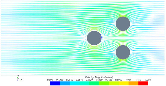These URANS simulations nicely captured the wake generated behind the upstream cylinder as it influenced the flow past the downstream cylinders. For comparison, Figure 21 presents the simulated streamlines without the presence of the cylinders, taken at the same time. As seen, the flow field was undisturbed as no cylinders were implemented. Of course, the method via the Morison equation could not account for such a phenomenon. The accelerated flow velocities in the gap between the downstream cylinders caused a certain amount of suction, and the influence of this suction was largely responsible for the deviation between hydrodynamic loads acting on the downstream cylinders obtained from URANS simulations and from calculations using the Morison equation.