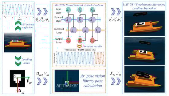 The overall framework of the method for precise UAV landing on a USV based on synchronized motion. Computer vision−based positioning to ensure that the UAV is always located directly above the landing mark center during the UAV landing process; a Bi-LSTM neural network is used to predict the USV attitude angle to ensure that UAVs respond to USV attitude changes in real−time; the UAV is controlled based on the PID algorithm, which makes the UAV and USV keep in synchronous movement for an accurate landing.