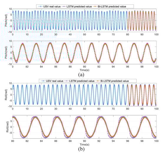 In the marine environment, the effects of USV pitch and roll motions on UAV landing on a USV are more obvious and needs to be focused on. In this paper, the attitude data of pitch motion and roll motion generated by the USV running in the simulation system for 100 s are selected, and the LSTM neural network model and Bi-LSTM neural network model are used for training and prediction, respectively. The prediction results are shown in Figure 5.