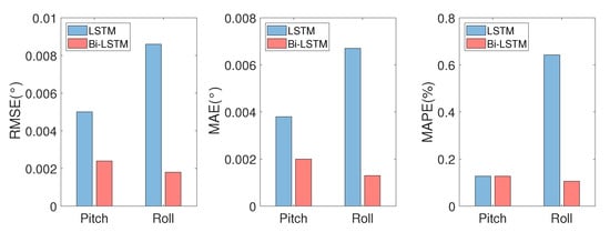 The smaller the error evaluation index is, the better the prediction results are. From the results of Table 2 and Figure 6, the Bi-LSTM neural network prediction model is compared with LSTM neural network prediction model. The former is used in the pitch angle prediction results, where evaluation index RMSE, MAE, MAPE decreased , , , respectively; in terms of the roll angle prediction results, the evaluation indexes RMSE, MAE, MAPE decrease , , , respectively. The results of the evaluation indexes show that the prediction results of the Bi-LSTM neural network model are more accurate and can better fit the actual attitude value of USV, which is more suitable for the UAV–USV synchronous motion landing control method in this paper.