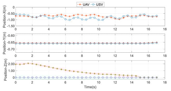 In order to verify the advancedness of the proposed method, several sets of comparison experiments were conducted between the proposed method and the UAV–USV conventional motion landing method. UAV–USV conventional motion means that the the UAV does not respond to a USV attitude change, and the landing process is vertical landing. Simulation results show that compared with the UAV–USV conventional movement landing method, the UAV–USV synchronous movement landing method can effectively improve the landing accuracy, which is more suitable for the UAV to realize autonomous and accurate landing in a harsh marine environment.