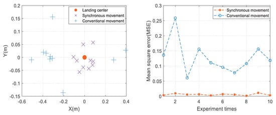 The landing accuracy of different control strategies can be obtained by calculating the two-dimensional Euclidean distance between the final landing point of the UAV and the center point of the USV deck. As shown in Figure 11 (left), the UAV–USV synchronous motion landing point is located in range 0.2 m × 0.12 m and the UAV–USV conventional motion landing point is located in range 0.9 m × 0.3 m. To facilitate the analysis, the mean square error (MSE) is introduced to determine the error from the landing center point. As shown in Figure 11 (right), the mean MSE of UAV–USV synchronous movement landing is 0.0731, and the mean MSE of UAV–USV conventional movement landing is 0.3509. According to the analysis results, in the case of USV pitching motion, the UAV–USV synchronous movement landing method proposed in this paper can achieve more accurate autonomous landing of the UAV.