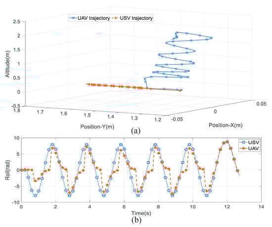 (a) USV roll motion−UAV–USV 3D trajectories; (b) the variation of UAV–USV roll angle.
