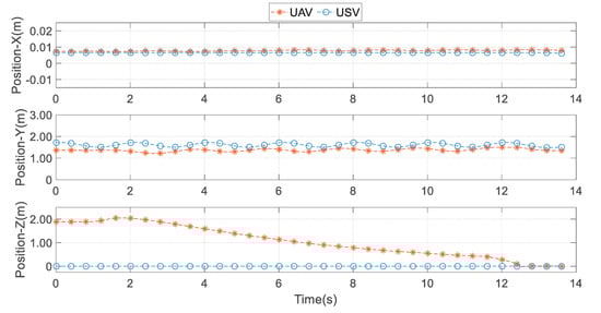 The position change of UAV during landing under USV pitching motion. The UAV can land in pitch motion within 14 s. The landing errors of the UAV final landing point and USV deck center in the direction are m and m, respectively. The two−dimensional Euclidean distance between the UAV’s final landing point and the USV deck center is m.