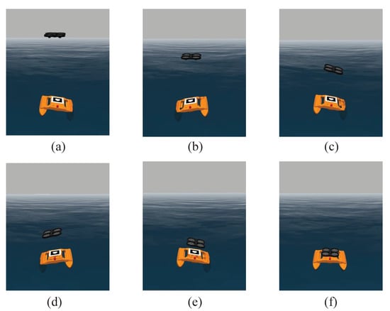 UAV landing autonomously on USV, affected by USV roll motion only. The UAV altitude does not reach the altitude threshold (set to 2 m), the UAV continues to descend in altitude (a,b); the UAV altitude is less than the altitude threshold , the UAV and the USV attitude remain synchronized (c,d); the UAV altitude is less than the altitude threshold (set to 0.2 m), the UAV accelerates to land on the USV (e); the UAV completes landing on the USV operation (f).