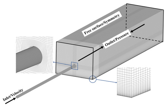 Figure 3 shows the distributions of GCI1-2 and GCI2-3 with the different numbers of grids. The values of GCI1-2 are significantly larger than the GCI2-3 which indicates that the refinement of the grid significantly improves the accuracy of the numerical simulation. The GCI1-2 forms a crest in the region 10 ≤ l/D ≤ 20, indicating that the accuracy of flow prediction in this region needs to be supported by a high grid density, while the relative error of the calculation results is significantly reduced after grid encryption. The mean values of GCI1-2 and GCI2-3 for the jet axial velocity V/Vb were 2.2% and 0.5%, and the maximum values of GCI1-2 and GCI2-3 are obtained at l/D = 10.3 and 23.1, and 4.7% and 1.0%, respectively. In summary, the simulation results with the basic grid show good accuracy. It is considered as the reasonable number of grids and selected for numerical simulation. Meanwhile, the accurate prediction of the boundary layer flow is also an important part of the numerical simulation process that cannot be neglected. Section 2.2 of the paper has already mentioned the proposed use of the standard wall function method for the near-wall flow in this numerical calculation. The standard wall function method uses empirical formulas to approximate the flow near the wall rather than directly solving for the complex flow in the corresponding region. Hence, the wall function method does not require high fineness of the boundary layer mesh, and it is usually sufficient to keep the y+ value of the first layer mesh between 11.5 and 400. A too large or too small y+ will make the nodes of the first mesh of the boundary layer out of the core region of the turbulence, thus making the wall function unavailable. It is verified that after the boundary layer of the mesh is encrypted, the minimum value of y+ for the first layer of the mesh in the computational domain is 13.8 and the mean value is 30.4, which meets the requirement of using the standard wall function. The mesh is depicted in Figure 4.
