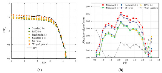 Results and analysis of V/Vb obtained from different turbulence models: (a) Distribution of axial velocity V/Vb along the axis of the jet; (b) Absolute error values of numerical results and PIV experiments.