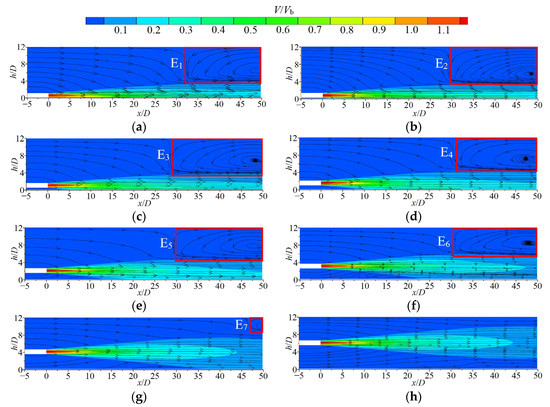 Contours with streamline diagrams of cross-sectional V/Vb distribution (oxz plane) in the jet under different H/D conditions: (a) H/D = 0.5; (b) H/D = 0.75; (c) H/D = 1; (d) H/D = 1.5; (e) H/D = 2; (f) H/D = 3; (g) H/D = 4; and (h) H/D = 6.
