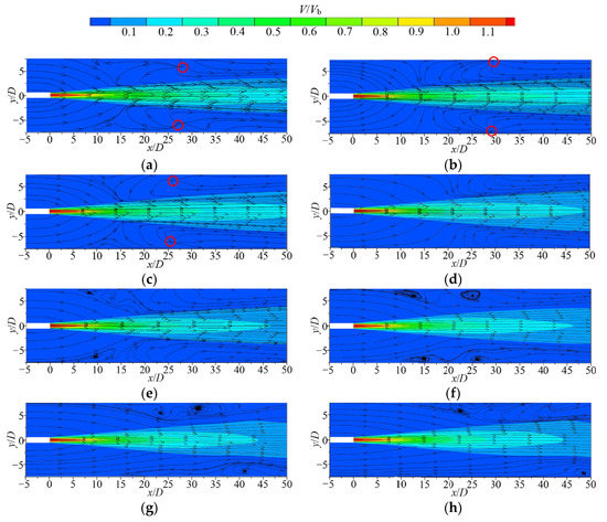 Contours with streamline diagrams of V/Vb distribution in the jet cross-section (oxy plane) under different H/D conditions: (a) H/D = 0.5; (b) H/D = 0.75; (c) H/D = 1; (d) H/D = 1.5; (e) H/D = 2; (f) H/D = 3; (g) H/D = 4; and (h) H/D = 6.