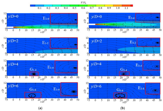 To understand the process of vortex generation and its development in the sink, the contours of V/Vb and streamlines for different vertical cross sections (oxz plane) at different horizontal heights (Re = 35,100) are compared and analyzed, as shown in Figure 8. Comparing Figure 7c with Figure 8a, it is not difficult to find that the formation of VRP originates precisely from the sinking of the fluid at the edges of the vortex caused by the spatial vortex structure consisting of E1-0 to E1-6. When H/D is 1, a vortex with a large influence range (E1-0) appears downstream of the jet outlet in the middle section. The scope of the vortex gradually decreases (E1-0~E1-6) during the development of this vortex to both sides. A vortex (G1-4) occurs near the bottom of the cross-section at y/D = 4. On the cross-section at y/D = 6, the core position of this vortex was almost unchanged. The vortex developed significantly, and the influence range gradually increased. At H/D = 3 and the same value of y, the scope of vortexes generated at the jet downstream outlet (E3-0 and E3-2) are smaller than those (E1-0 and E1-2) generated in H/D = 1. The reduction in space above the jet and the increase in the volume of entrainment below contribute to this phenomenon. The position of the vortex core moves along the +z direction as well. Meanwhile, the vortexes G3-4 and G3-6 move gradually in the +x direction. Therefore, the incidence height H/D affects the size and location of the vortex in the flow field. There are obvious wall vortexes that are generated and well developed on both sides along the y-direction.