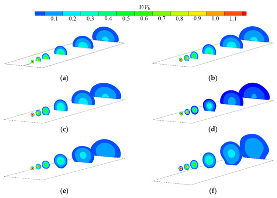 Distribution of near-wall dimensionless velocity V/Vb at different incidence heights H/D: (a) H/D = 0.5; (b) H/D = 0.75; (c) H/D = 1; (d) H/D = 1.25; (e) H/D = 1.5; and (f) H/D = 2.
