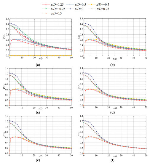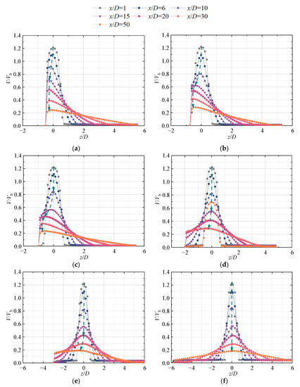 Axial V/Vb distribution in the mid-section (oxz plane) of the jet under different H/D conditions: (a) H/D = 0.5; (b) H/D = 0.75; (c) H/D = 1; (d) H/D = 2; (e) H/D = 3; and (f) H/D = 6.