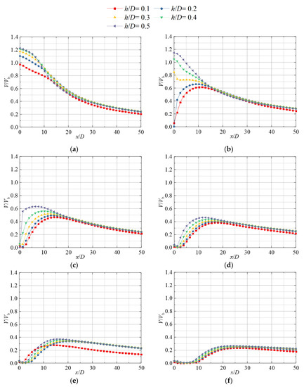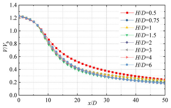 Figure 11 shows the distribution of V/Vb along the axis of the horizontal jet at different horizontal heights (Re = 35,100). The trends are similar at different horizontal heights. In the initial range (0 ≤ x/D ≤ 6), the values of V/Vb decrease slowly from 1.23 to 1.15. When the jet further develops, it decays rapidly to about 0.4 in the region of 6 ≤ x/D ≤ 25. As x/D continues to increase, the rate of decrease in V/Vb slows down and gradually fluctuates around 0.2. At the same time, due to the influence of the bottom wall, the mixing effect with the ambient fluid below the jet is greatly weakened. This is why the values of V/Vb of the horizontal jet with H/D = 0.5 are up to 1.29 times larger than those of other horizontal heights in the region of x/D > 6.