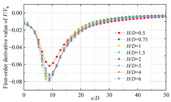 The distributions of each axial velocity have obvious inflection points. The horizontal inundation jet is divided into two zones. In zone I, the velocity drops sharply. In zone II, the drop of axial velocity slows down. To explore the general law of the inflection point, its first-order derivative image is made, as shown in Figure 12. The minimal value points of the V/Vb distribution curves under different H/D conditions are more concentrated and are all located near x/D = 10, suggesting that the inflection points of each axial velocity distribution curve have high consistency. The initial velocity of the jet is very fast after it is ejected from the outlet and mixed with the ambient fluid. During the process, there is a strong energy exchange and the axial velocity decreases along the course. As mentioned above, the cross-sectional area increases while the jet flow increases along the range, due to the entrainment effect, which leads to increased resistance of the main stream of the jet during its development, thus leading to an increase in the decay rate of the jet axial velocity and reaching a maximum at x/D = 10. As for x/D > 10, the jet gradually develops completely, and the energy exchange and entrainment effect then reach a relative equilibrium. The axial velocity decay rate remains at a low level and decreases along the range, which leads to an obvious inflection point on the V/Vb distribution curve. Further exploration reveals that although the extreme points (inflection points) of the first-order derivative images of each curve are consistent, there are large differences in their distributions of extreme value. When the horizontal height H/D is taken as 0.5 and 1.5, respectively, the extreme values of the corresponding axial velocity distribution curves obtain the maximum or minimum values. This indicates that at H/D = 0.5 and 1.5, the absolute value of the jet axial velocity gradient at the inflection point (x/D = 10) achieves the minimum and maximum values, respectively, due to the wall effect generated at the bottom wall. With the full development of the jet, a situation diametrically opposite to that described earlier emerges: the absolute value of the velocity gradient of V/Vb is maximum when the horizontal height H/D = 0.5, and the absolute value of the velocity gradient of V/Vb is minimum when the horizontal height H/D = 1.5.