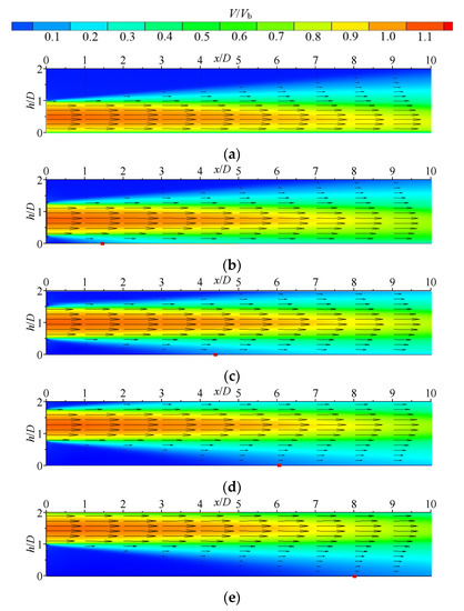 Contours with vector diagrams of jet velocity distribution at different incidence heights H/D: (a) H/D = 0.5; (b) H/D = 0.75; (c) H/D = 1; (d) H/D = 1.25; and (e) H/D = 1.5.